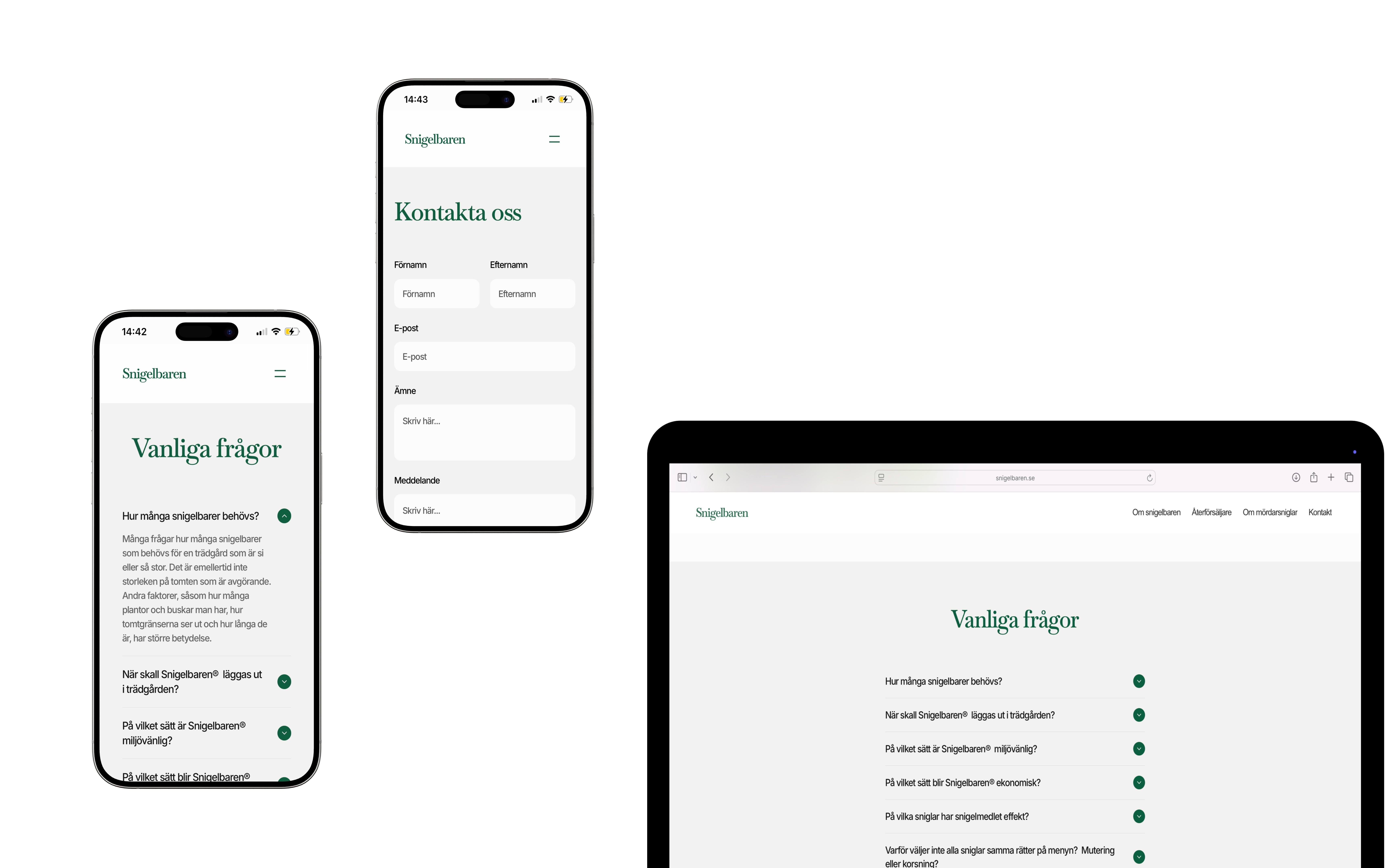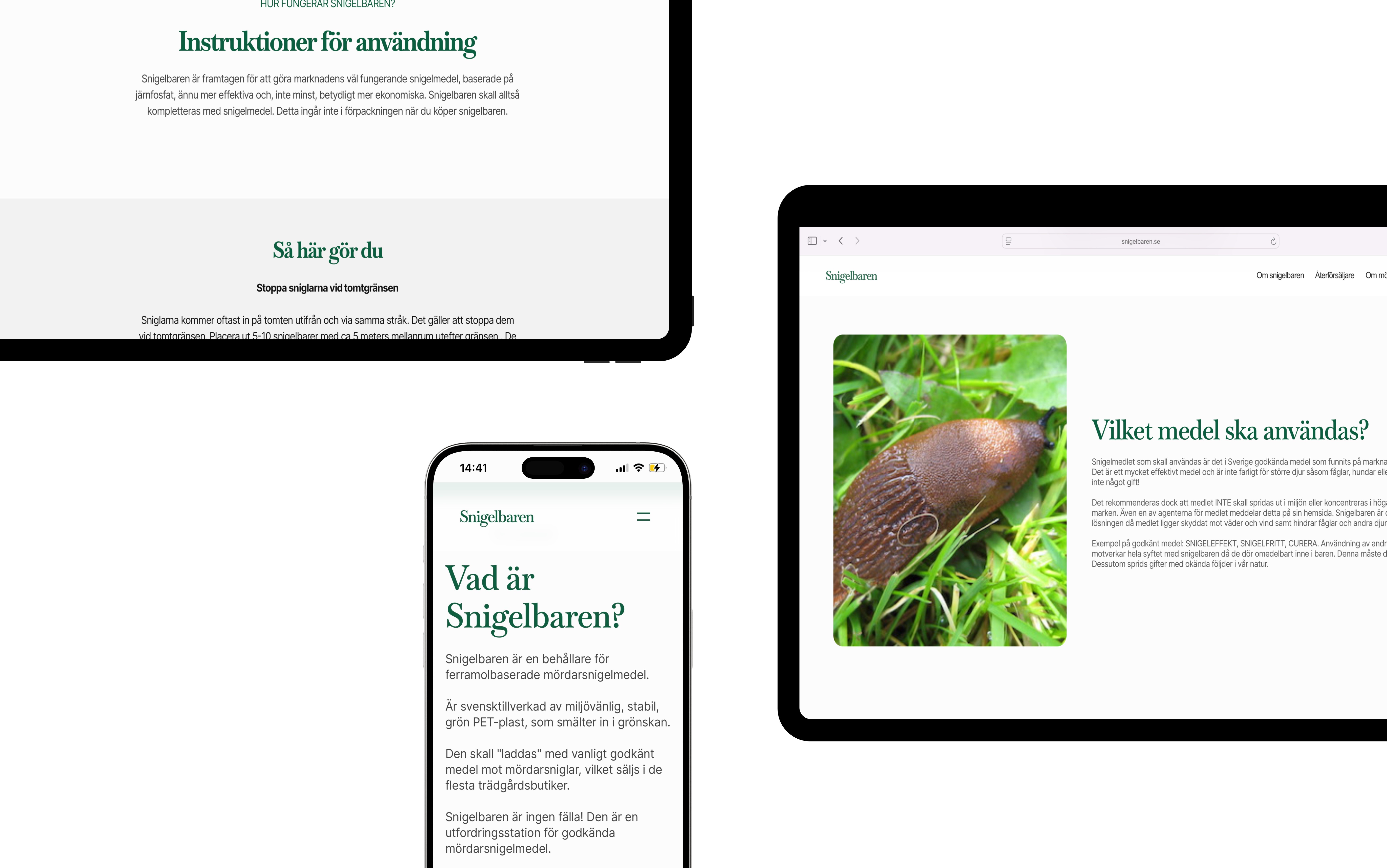 In the Snigelbaren project, I redesigned an existing website to make it cleaner, more modern, and easier to use. The main focus was to improve the structure, navigation, and content so visitors can quickly understand the product and its benefits. I worked on highlighting the eco-friendly solution and making it easy to find instructions and local retailers. The final website clearly presents the product, builds trust, and helps gardeners take action in a simple and effective way.