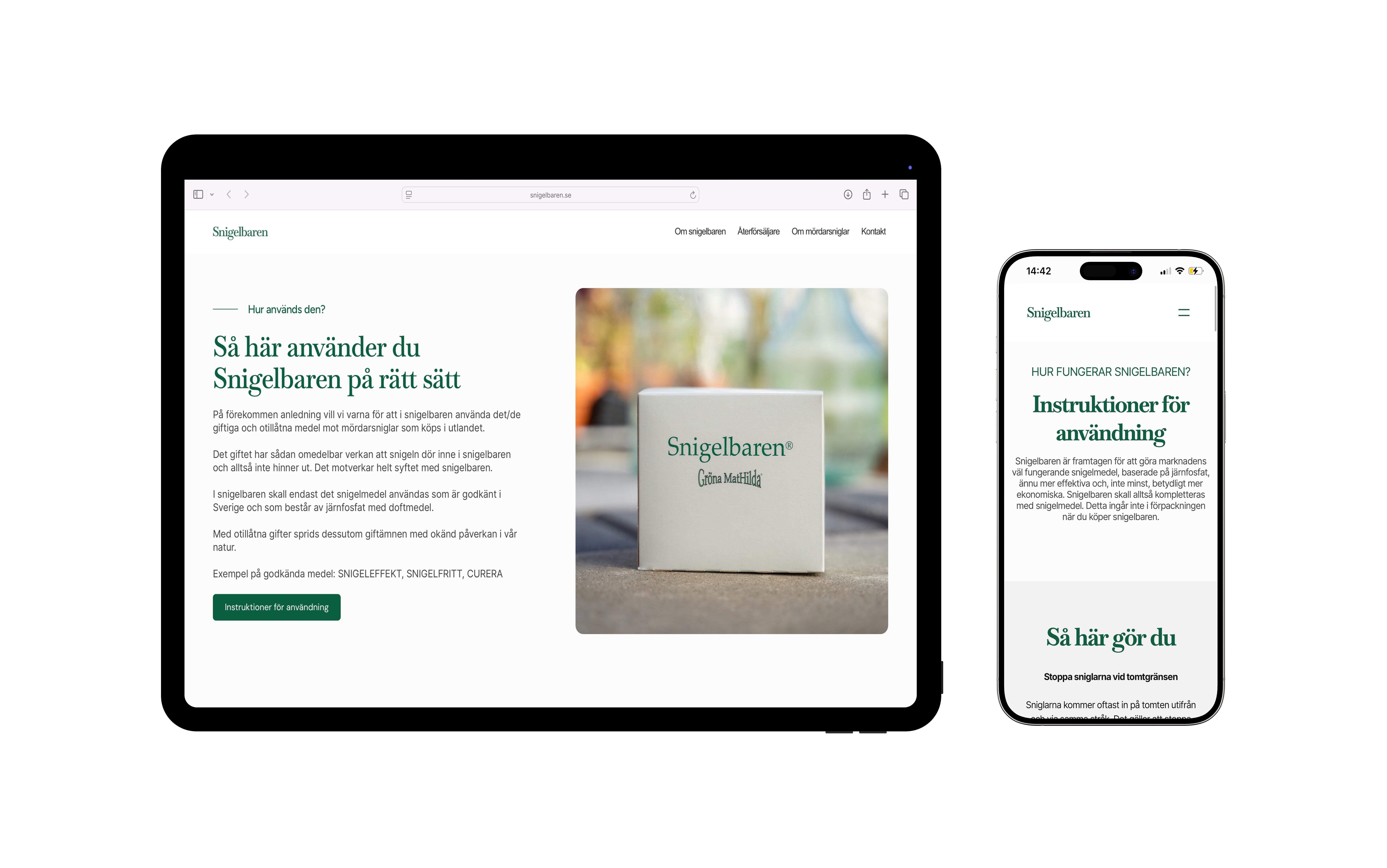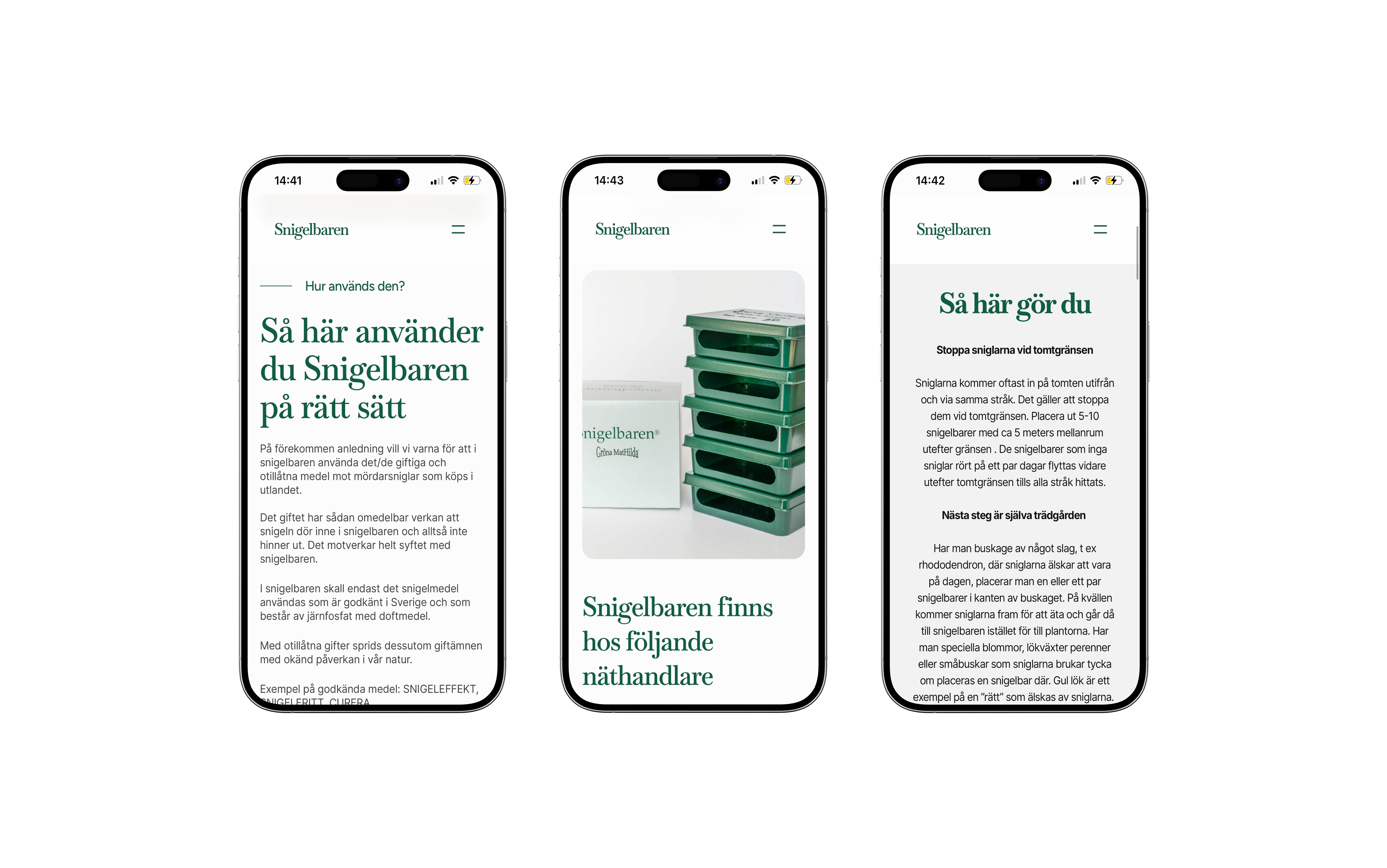 I redesigned the website for Snigelbaren, a Swedish gardening product that helps fight invasive slugs in an eco-friendly way. The goal of the redesign was to create a cleaner, more modern, and user-friendly experience that highlights the product’s benefits and makes it easier for visitors to find instructions and local retailers. My work included restructuring the navigation for better usability and improving the overall content layout to balance information with clear calls-to-action.
