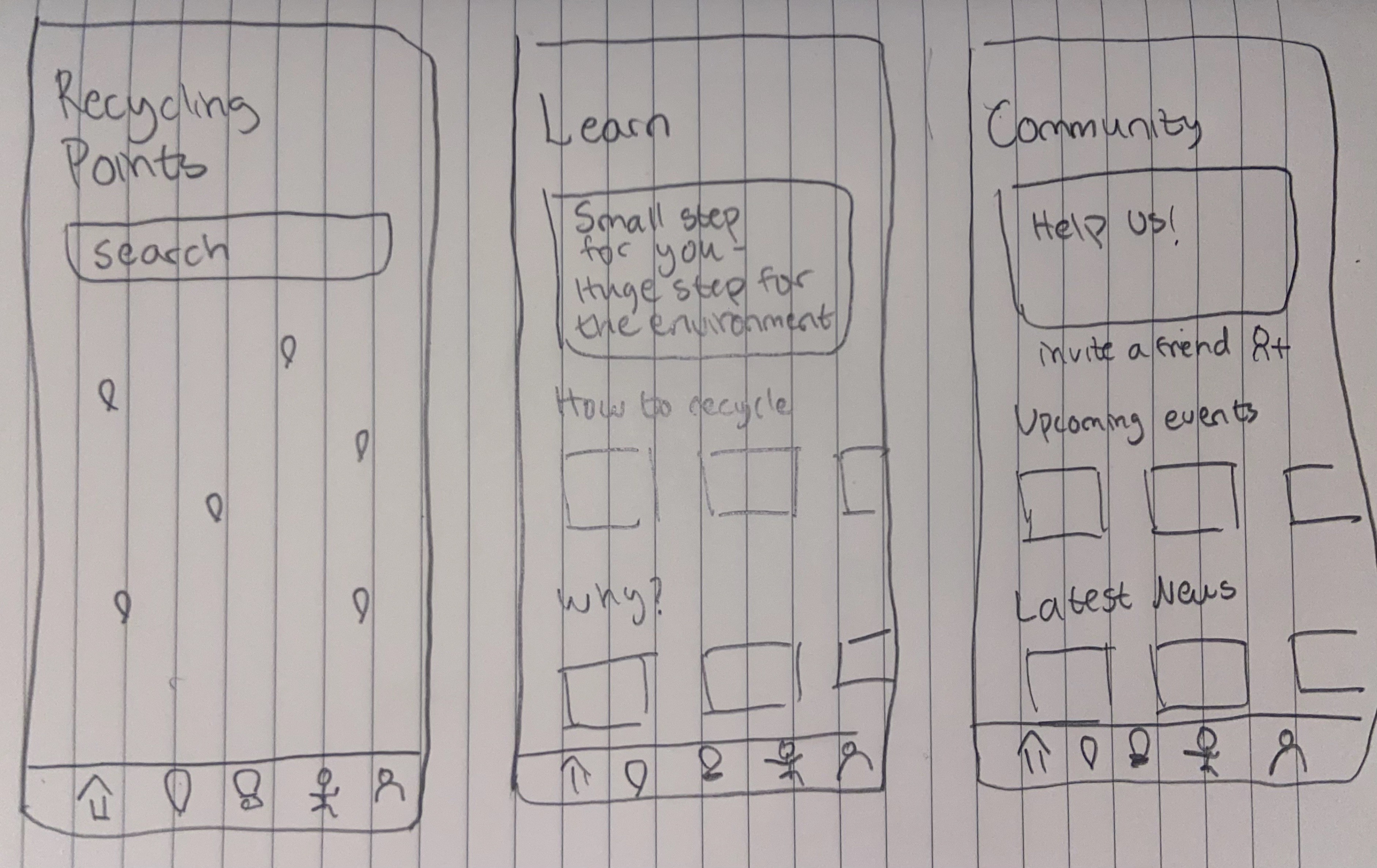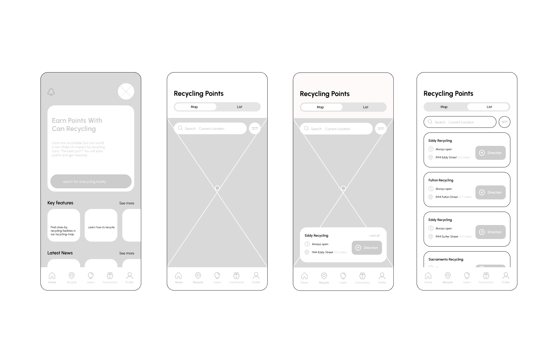 With all the research and info I gathered, it was time to start designing the app's crucial parts, like the main recycling info section and the community page. I thought about the different situations users might be in when using the app, whether they're in a hurry, on the bus, studying, or just relaxing at home, to make sure the app's design works well for them in any scenario.